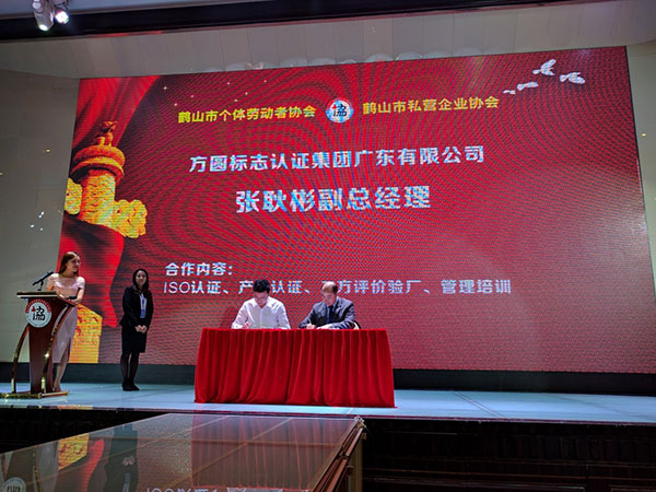 会上,在各界见证下,优发国际广东公司张耿彬副总经理代表公司与鹤山市个体劳动者协会、鹤山市私营企业协会签署战略合作伙伴协议,公司将在认证、管理培训、增值服务、二方评价等方面进一步为鹤山各届商企单位提供优质的技术服务。